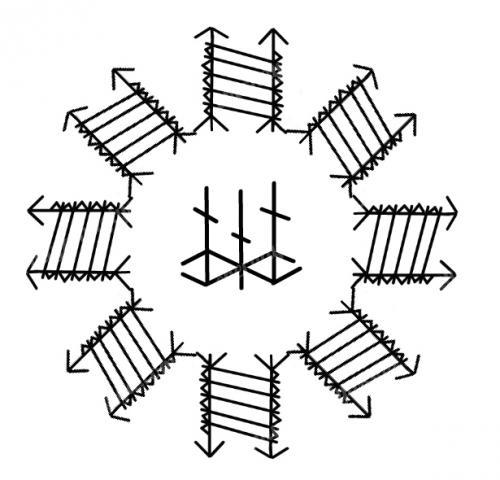 2 Иса (по бокам от центральной группы) + Хагалаз (большой) + 2 Хагалаз (маленькие, сверху и снизу от большого, между боковыми Исами и центральной Исой) + 2 Турисаз - уничтожение, разрушение, отсечение, разрушение всех связей, привязок, всего, что держит вместе, чувств, всех возможностей возродить отношения, перевести их в какое-то другое состояние и тд и тп.