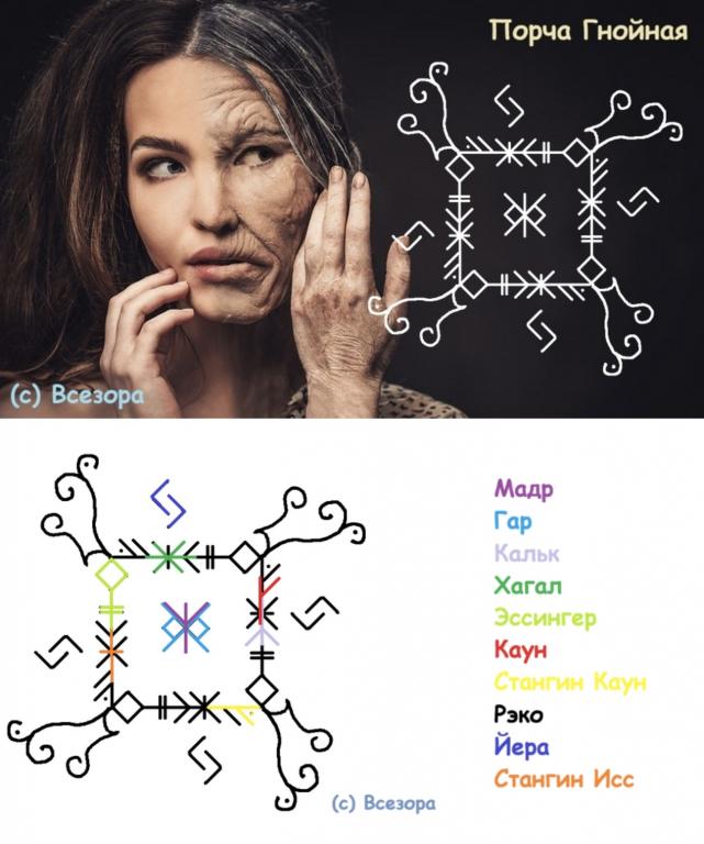 Порча Гнойная. Автор Всезора Руны: Мадр + Гар — кожа объекта Кальк + Хагал — снятие защит, ослабление иммунитета Эссингер — привлечение инфекций, загрязнений, воспалений Каун — гнойные болезни кожи: язвы, фурункулы, гнойники, акне и т.п. Стангин Каун — болезни, которые прогрессируют и вызывают постоянные боли и страдания у объекта Рэко + Йера — постоянно разрушается чистота и красота кожи Стангин Исс — прячет оператора и его работу Оговор: Сила ДРЗ в самом скором времени, ломает защиты и вызывают ослабление иммунитете у объекта (...). ДРЗ притягивают к объекту различные инфекционные заболевания, вызывают загрязнения, воспаления и гнойные болезни кожи, которые не заживают и вызывают сильные боли и страдания у объекта, при этом прогрессируют и уродуют его внешность, разрушая чистоту и красоту кожи. ДРЗ прячут оператора и его работу от просмотра. Активация. ТБ.