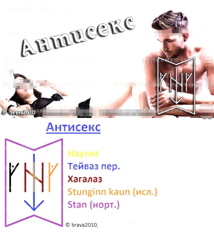 Став Антисекс. Автор brava2010 Став наносится на фото объекта в районе половой чакры. Способствует развитию импотенции и заболеваний половой сферы у мужчин. Руны: Наутиз — принудительно Тейваз пп — обессиливает МЧ, «нестояк» Хагалаз — разрушает половую функцию Стангин каун — вызывает болезни извне или активизирует хронические заболевания (при использовании данной руны необходимо иметь активные защиты и отсутствие ран на теле) Стан — не дает возможности восстановиться Примерный оговор: ДРС заставляет (...) испытывать бессилие в сексуальных отношениях, разрушает его половую фунцию, вызывает болезни и лишает возможностей восстановления и нормализации сексуальной жизни. ( не забываем указывать активацию, дезактивацию, ТБ ....)