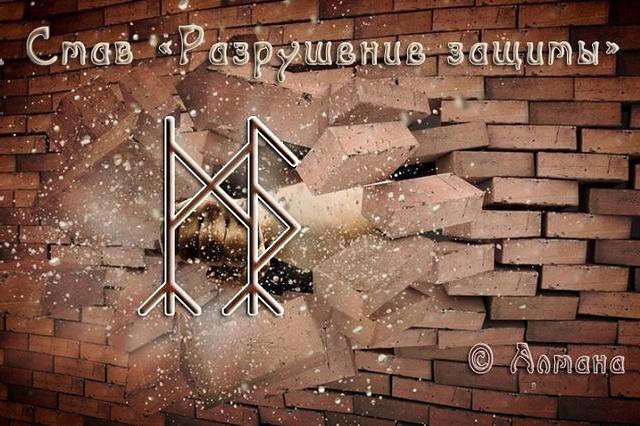 Став «Разрушение защиты». Автор Алтана Став «Разрушение защиты» Автор Алтана Данный став ослабляет природные и ставленные защиты врага и делает его уязвимым для наших воздействий, не давая ему повода для беспокойства. Руны: Манназ - объект Calc двойной – уничтожение защит, ослабление врага Турисаз - отсечение защит Ансуз+Лагуз - внушает врагу мысль, что беспокоиться не о чем. Йера - энергия и непрерывность воздействия Оговор: «Силой данных рун я ослабляю и отсекаю ставленные и природные защиты (имя), делая ее (его) уязвимой для моих магических воздействий, одновременно убеждая (имя) в собственной неуязвимости, защищенности и естественности происходящего Данная руническая формула начинает работать немедленно после активации, активируется огнем. Работает без вреда для оператора и его магической практики. Деактивируется сжиганием фото. Силой рун и моей волей. Да Будет Так.» Алтана